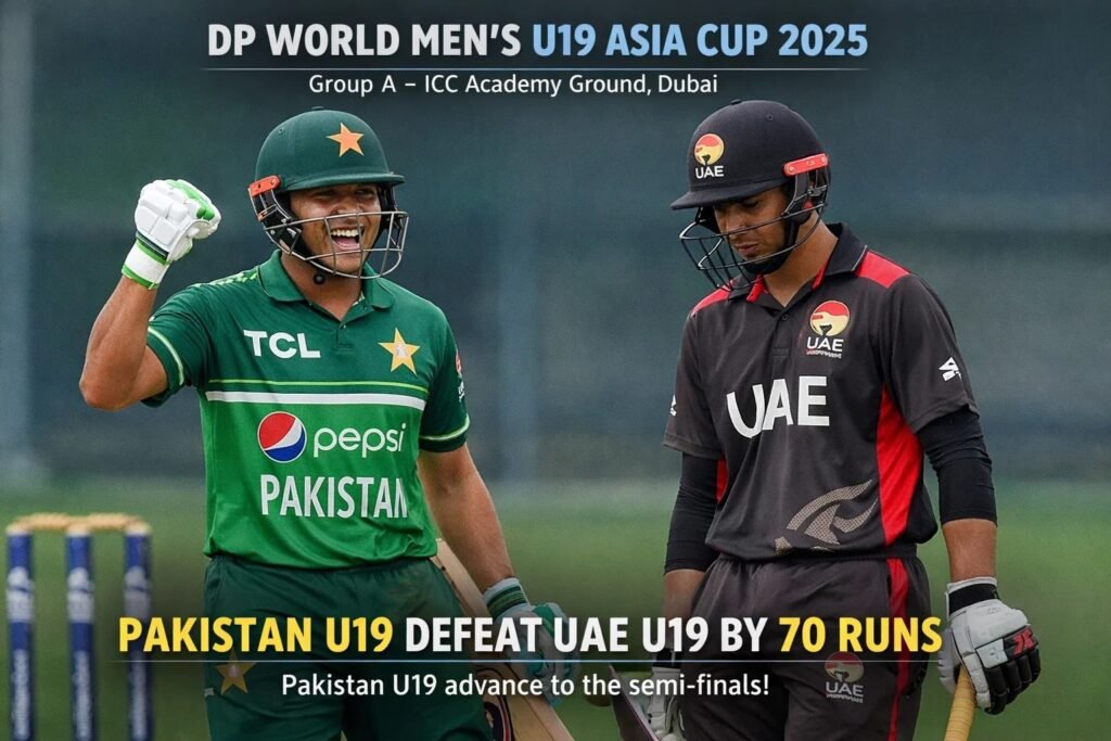 دبئی (16 دسمبر 2025) پاکستان انڈر 19 ٹیم نے گروپ اے کے آخری میچ میں میزبان متحدہ عرب امارات کو 70 رنز سے شکست دے کر انڈر 19 ایشیا کپ کے سیمی فائنل کے لیے کوالیفائی کر لیا۔ گرین شرٹس نے ٹاس جیت کر پہلے بیٹنگ کی اور 50 اوورز میں 9 وکٹوں کے نقصان پر 241 رنز بنائے۔ احمد حسین نے 65 رنز کی شاندار اننگز کھیلی، سمیر منہاس نے 44 اور وکٹ کیپر حمزہ ظہور نے 42 رنز اسکور کیے۔ یو اے ای کی طرف سے یوگ شرما نے 3 اور نسیم خان نے 2 وکٹیں حاصل کیں۔