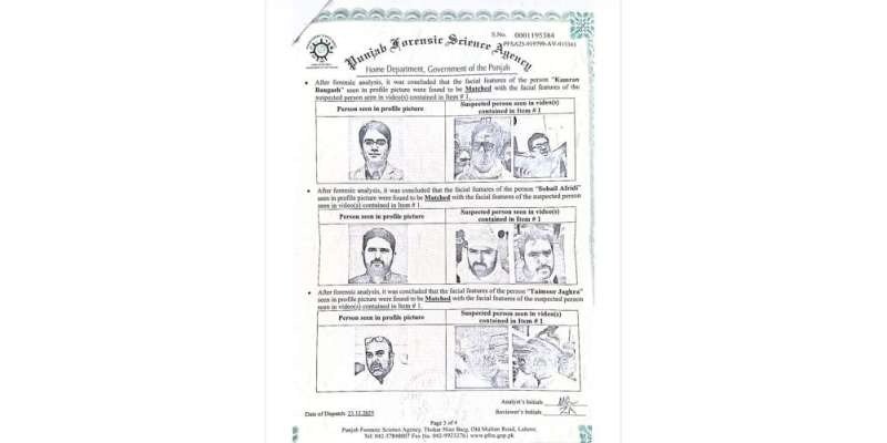فرانزک لیبارٹری نے سہیل آفریدی کی پروفائل تصویر کو ویڈیو میں موجود شخص سے ملایا اور دونوں کو ایک ہی قرار دیا۔ اسی طرح کامران بنگش، تیمور جھگڑا اور عرفان سلیم کی پروفائل تصاویر بھی ویڈیوز میں موجود افراد سے مطابقت رکھتی ہیں۔ رپورٹ کا تجزیہ 19 سے 23 دسمبر 2025 تک مکمل کیا گیا، اور یہ صرف ویژول مواد تک محدود رکھا گیا۔